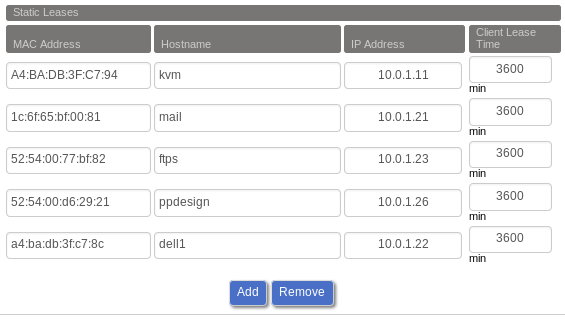 Därför väljer vi den näst enklaste, nämligen dnsmasq. Den finns i Linux-datorer, men också i olika router-operativ, t ex DD-WRT och Openwrt. Jag ska försöka ge ett exempel på hur man lägger upp det i DD-WRT. Det första vi ska göra är att redigera hosts-filen i vår router. Den finns i /etc/hosts om du ska nå den från terminalen. Jag väljer att använda det grafiska gränssnittet för att göra ändringar. Gå till sidan Services - Services på DD-WRT. Det kan givetvis vara olika från version till version på DD-WRT. Men här skriver du in mac-adressen på den dator som ska vara med och namn, ipadress och hur länge uppgiften ska behållas; 3600 minuter kan rekommenderas.