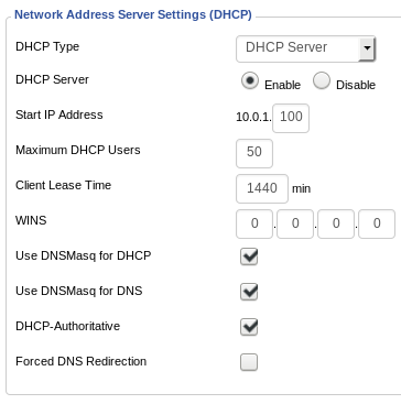 Vår dns-server kan också fungera som dhcp-server. Det gör den otroligt användbar. I DD-WRT skriver vi in adressomfång vi önskar ge klienterna. Som ni ser nedan får de som inte har en fast adress i det lokala nätverket adresser mellan 10.0.1.100 och 10.0.1.149