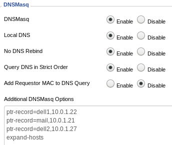 För den som behöver reverse-dns lägger man till en rad i Services -Services - Additional DNSMasq Options