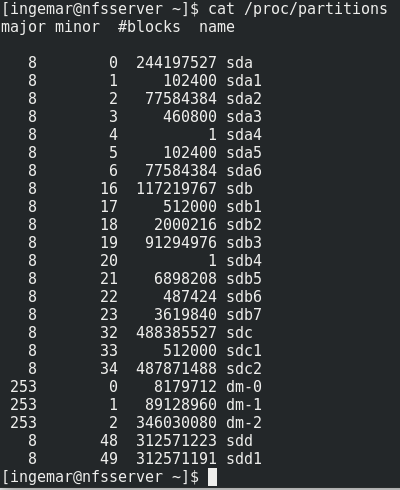 Nu vet jag att sdd1 är den diskpartition jag ska använda tack vare de tidigare kommandona df och lsusb. Det finns givetvis fler kommandon som t ex lsblk och blkid för att ta reda på vilka partitioner man har att jobba med.