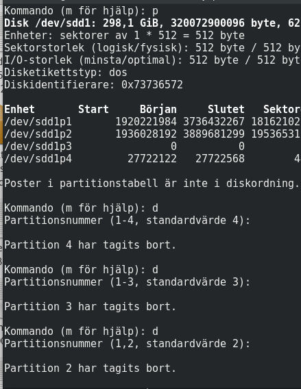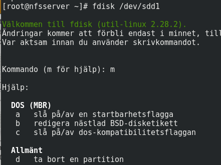 Nu är vi inne i interaktivt läge och kan utföra kommandon med själva fdisk direkt utan att anropa det programmet.