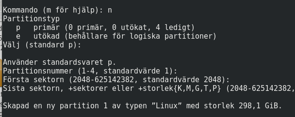 n för ny partition och det blir automatiskt partition 1 om vi inte ändrar.