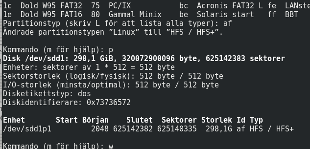 Glöm inte att usb-minnet fortsatt ska vara omonterat. Eller gör ett filsystem som kan användas i MacosX; som i exemplet nedan. Det kan du ha som backup till exempel.