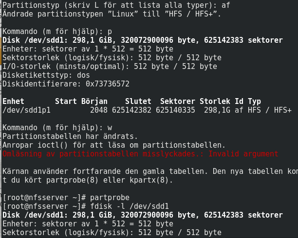 Avsluta med w för att skriva in partitionstabellen. För att slikppa starta om Fedora-maskinen kör jag partprobe vilket gör att kärnan kan läsa in den nya partitionstabellen. Till slut skapar vi filsystemet.