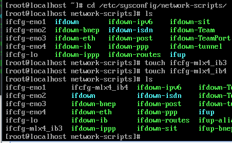 Sen är det dags att skriva konfigurationsfilen för infiniband i /etc/sysconfig/networks-scripts. Som ni ser kallar jag min ifcfg-mlx4_ib4 men jag har också en ib3 på samma maskin eftersom varje kort har två portar. Jag har valt att köra 0.1-adresser på slutet för två av portarna, 1.1-adresser på två andra portar och till slut 2.1-adresser på de två sista portarna. Jag skulle rita en nätverkskarta så blir det enklare att förstå. Men jag har tre fysiska maskiner, och var och en av dem har ett infiniband-kort med två portar i varje. Så i och med det har har varje maskin kontakt med två maskiner via de två infiniband-portarna. Jag nämner också att för varje anslutning behövs det en opensm-manager. För att det ska fungera ska alltså varje server ha en egen opensm-manager. Jag kommer snart in på hur opensm ska konfigureras. Om vi skulle ha en infiniband-switch skulle vi inte behöva opensm-manager. Men detta är ju en snikvariant så det är därför uppsättningen är så här. Följ bara kommandona i den första bilden nedanför. Jag skapar helt enkelt bara konfigurationsfilerna manuellt.