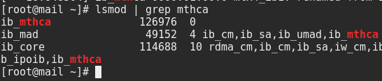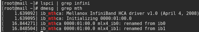 Med dmesg, som visar vad som har hänt när Linux startar, ska vi få svar på om Linux har hittat infiniband-korten. Om du ser något i stil med vad min terminal meddelar har korten hittats. Det betyder att drivrutinerna också är laddade.
