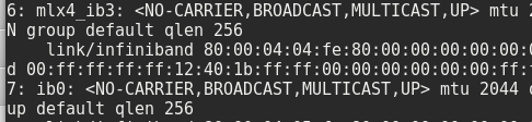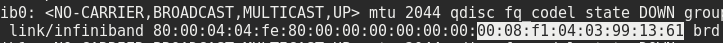 Nu ska vi lägga in lite uppgifter i olika konfigurationsfiler för att få det att fungera. Vi börjar med att döpa om enhetsnamnen på infiniband. Normalt heter dem ib0, ib1 och så vidare. Först måste vi ha en del av mac-adressen för infiniband.
