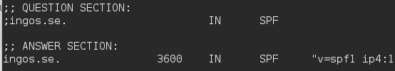 En del av svaret kan se ut så här. I ANSWER SECTION visas det här och det betyder att dns-servern har en spf-anvisning.