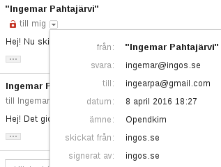 Här ser ni att det står dkim=temperror. Det betyder att mottagande e-postserver inte kunde identifiera den publika nyckeln på dns-servern och därmed inte låsa upp den privata nyckeln. Men här nedanför ser ni att Google bekräftar att DKIM fungerar och därför står det signerat av: ingos.se. Om det inte fungerar står det inget alls. Det här hittar ni i informationsfältet när ni klickar på den lilla pilen. Ni ser det på bilden nedan.