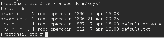 Nu ska vi göra nycklar med hjälp av följande kommando. Nycklarna hamnar i /etc/opendkim/keys och består av en privat och en publik nyckel.