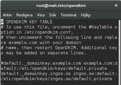 Nu återstår det inte så mycket av jobbet. Vi ska redigera fyra textfiler och lägga till den publika nyckeln i dns-servern. Vi börjar med opendkim.conf och jag ska visa vad som ska finnas i den.