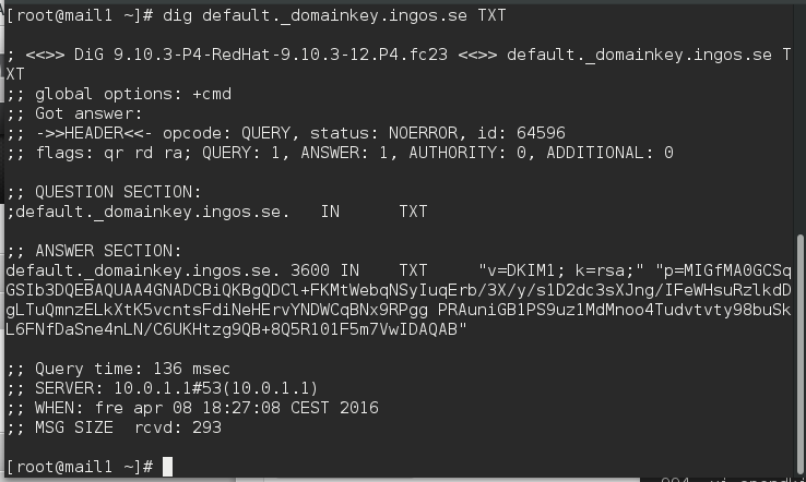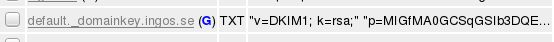 Det sista är att göra den publika nyckeln tillgänglig för mottagande e-postservrar. Det gör man genom att sätta in ett TXT-textavsnitt i DNS-servern. Jag visar en bild här nedan på hur det såg ut för mig. Men det finns många olika dns-servrar och tjänster så det går inte att täcka alla. Var beredd på att det kan krångla innan man hittar rätt. Testa med dig på det sätt som jag visar längst ner så ser ni om det fungerar. Därefter kan man prova med någon av de otaliga tjänster som finns på nätet. Googla på "dkim check" så hittar ni en hel del. På de siterna skriver man sedan in domännamnet i en ruta och selectorn i den andra. För mig blir det ingos.se och default. Men det beror på vad ni har för domän och vilken selector ni valde.