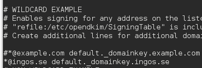 I filen SigningTable lägger vi till följande innehåll. Asterisken framför @ingos.se gör att alla som har en e-postadress med domännamnet ingos.se får sin e-post signerad av Opendkim. Till exempel olle.andersson@ingos.se eller erik.olsson@ingos.se; ja ni förstår säkert.