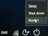 För att byta drivrutinen eller återinstallera den ska vi alltså försöka starta datorn i felsäkert läge. På Windows XP:s tid och även i senare versioner gällde det att trycka upprepade gånger på F8 vid start för att komma till alternativet felsäkert läge. Men i Windows 10 ska du vid inloggningsrutan klicka på avstängningssymbolen nere till höger. Skulle det vara så att du inte ens kommer så här långt kan det gå att komma till felsäkert läge genom att stänga av datorn med strömknappen. Det är inget att rekommendera, så gör det bara en gång och försök sen att starta datorn. Ofta känner Windows av att något gått snett och erbjuder start av felsäkert läge. Skulle inte heller det gå behöver du starta datorn med Windows reparationsprogram antingen på skiva eller usbpinne.