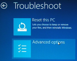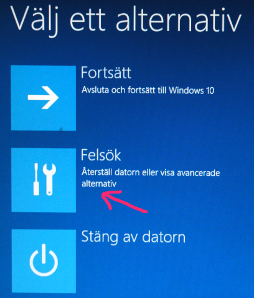 Och då kommer du till en blå skärm med flera alternativ. Här ska du välja felsök. Vid nästa alternativ ska du välja "Avancerade alternativ" ("Advanced options" om du har på engelska).