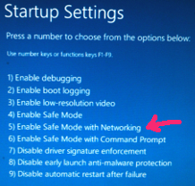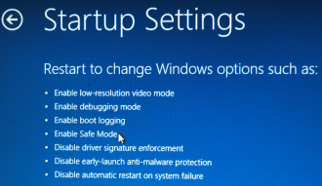 Efter det fick jag alternativen här nedan och som synes så valde jag "Startup settings" (på svenska något i stil med startinställningar). I nästa ruta valde jag "Enable safe mode"; alltså felsäkert läge.