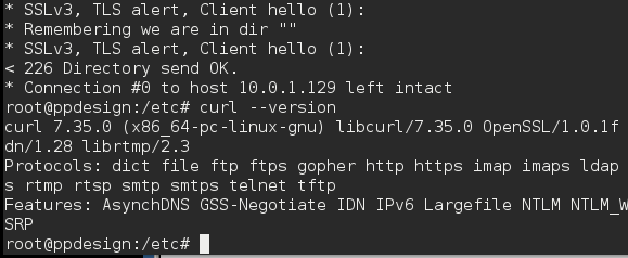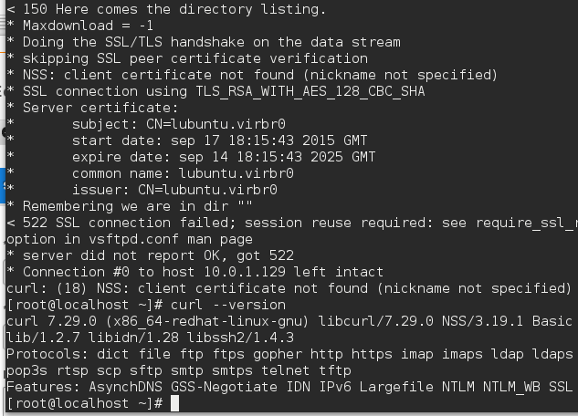 Curl fungerar inte med NSS om man ska använda den som ftp-klient för att ansluta till en vsftp-server som ska köra krypterad trafik. Däremot går det bra att ansluta när Curl använder sig av Openssl-biblioteket i stället. Jag upptäckte problemet när jag försökte ansluta till min vsftp-server från Fedora 23. Det gick inte. Däremot gick det bra när jag anslöt från Lubuntu. Den använder Openssl för att ansluta krypterat. Den första skärmdumpen visar att anslutningen misslyckades, och att curl använder sig av nss.