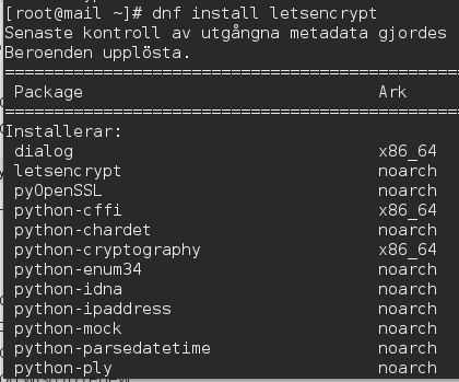 Följande bilder visar hur enkelt det kan vara att installera certifikat på din webbserver. Vi börjar med att installera letsencrypt. Det här gjordes i Fedora 23 och givetvis skiljer det sig åt beroende på operativsystem.