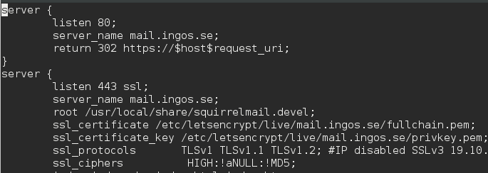 När det var gjort behövde jag kopiera fullchain.pem och privkey.pem från webbservern till min proxyserver (som också kör Nginx) Konfigurationsfilen (som finns i /etc/nginx/sites-enabled/) i proxyservern anger sökvägen till certifikaten på den servern. För att förtydliga: jag har alltså certifikaten på två ställen, dels på proxyservern, dels på webbservern som kör siten. Proxyservern är den som tar emot trafiken från internet och sen vidarebefordrar trafiken till min webbserver.