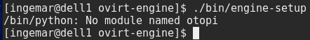 För säkerhets skull kör jag engine-cleanup först i /home/dinanvändare/ovirt-engine. Nu har jag installerat om otopi och det som verkar ha hjälpt är att jag angav ./configure --prefix=/usr och då försvann meddelandet om att No module named otopi. Men vi får se om det felmeddalndet återkommer. Det som till slut löste saken med otopi var att installera den med ett prefix i /usr för att den i standardinsallering hamnade i /usr/local. Körconfigure på det här viset med några parametrar.