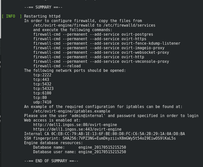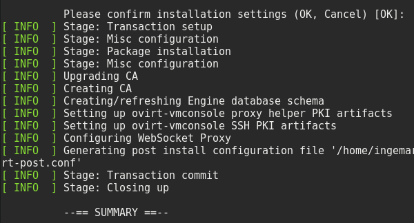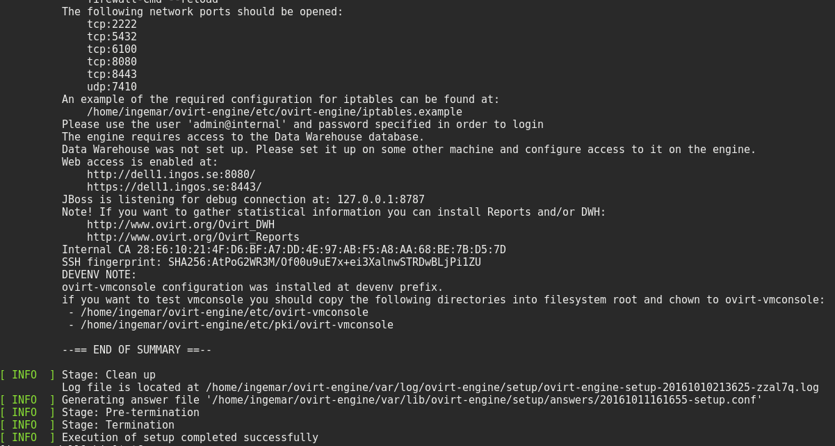 Och då äntligen gick det att installera Ovirt-engine med skriptet engine-setup. Och egentligen är det väl inget konstigt. Ovirt fungerar tydligen bara med en_US.UTF-8 och är den inte installerad fungerar det inte. På Fedora 24 kan du kontrollera om språkpaketet finns genom att titta i /usr/lib/locale