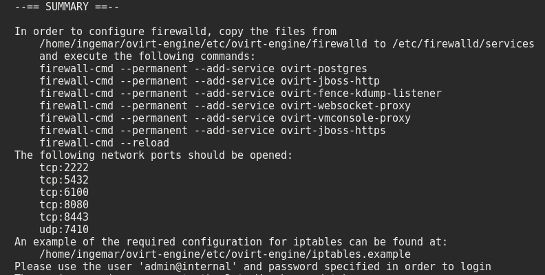 Nu när alla beroenden är installerade fungerar engine-setup. Den ska köras som vanlig användare för att installera en utvecklingsversion. Vad det betyder måste jag först ta reda på.